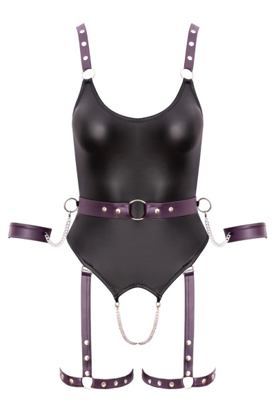 Ce body à jarretelles ouvert, signé Cottelli BONDAGE, est une véritable invitation à l'érotisme. Conçu dans un tissu noir mat et élégant, il est entièrement élastique et doux pour un confort exceptionnel. Des détails décoratifs en violet foncé noble et des accessoires argentés viennent sublimer la silhouette.