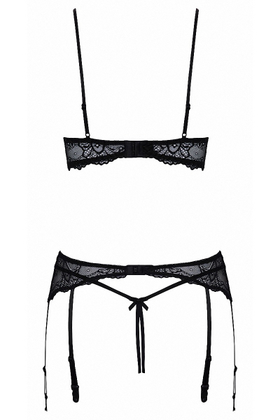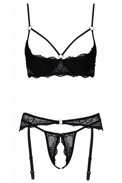 Cet ensemble coquin Cotelli Lingerie est fabriqué en fine dentelle noire. Il est composé d'un soutien-gorge seins nus, d'un porte-jarretelles et d'un string ouvert assortis.